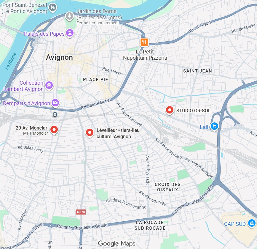 – Maison pour Tous (MPT) de Monclar : 20 avenue Monclar 84000 AVIGNON (face au square Indochine et à la boulangerie bio Pindare)